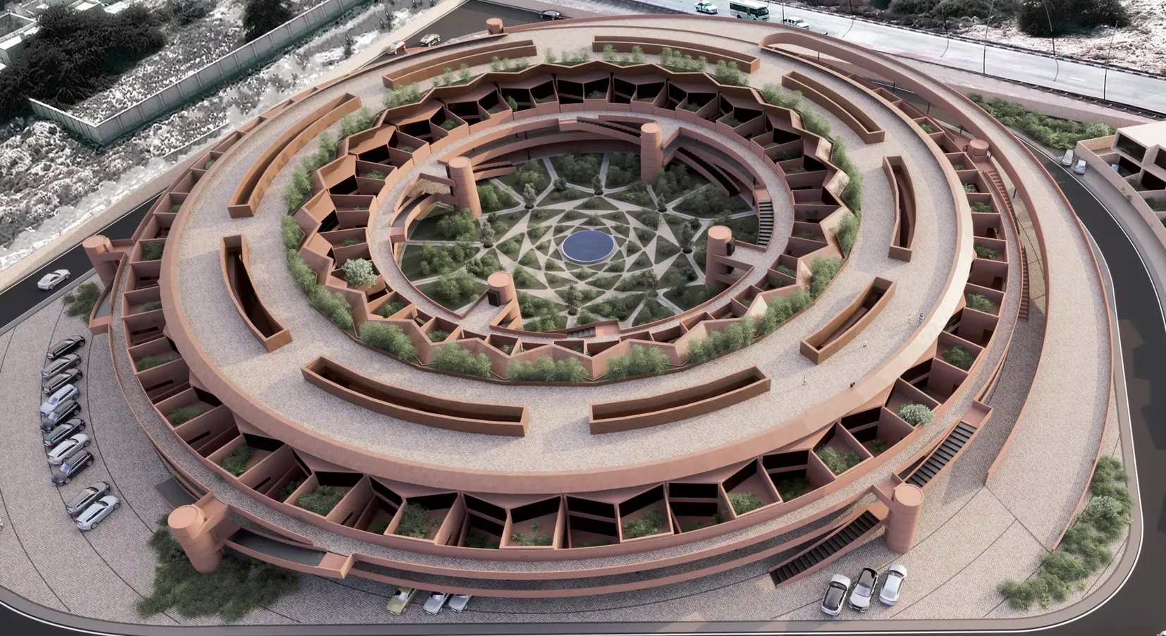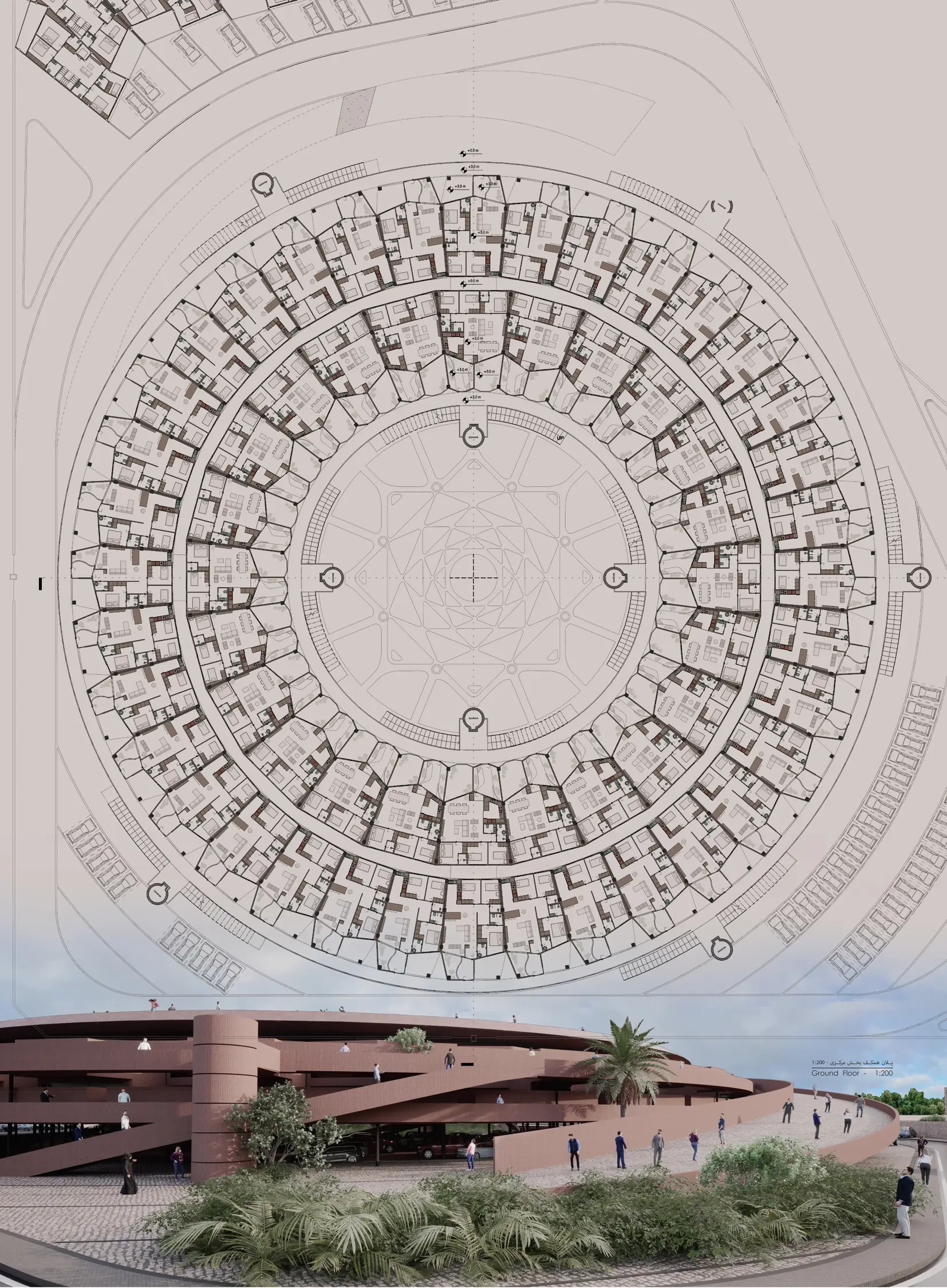 برای رسیدن به این هدف، فرم کلی پروژه بر اساس چیدمان دایرهای خانهها پیرامون یک فضای مرکزی شکل گرفت. این فرم، نه تنها امکان دید باز را فراهم میکند، بلکه خوانایی و هویت بصری قدرتمندی به پروژه میبخشد.