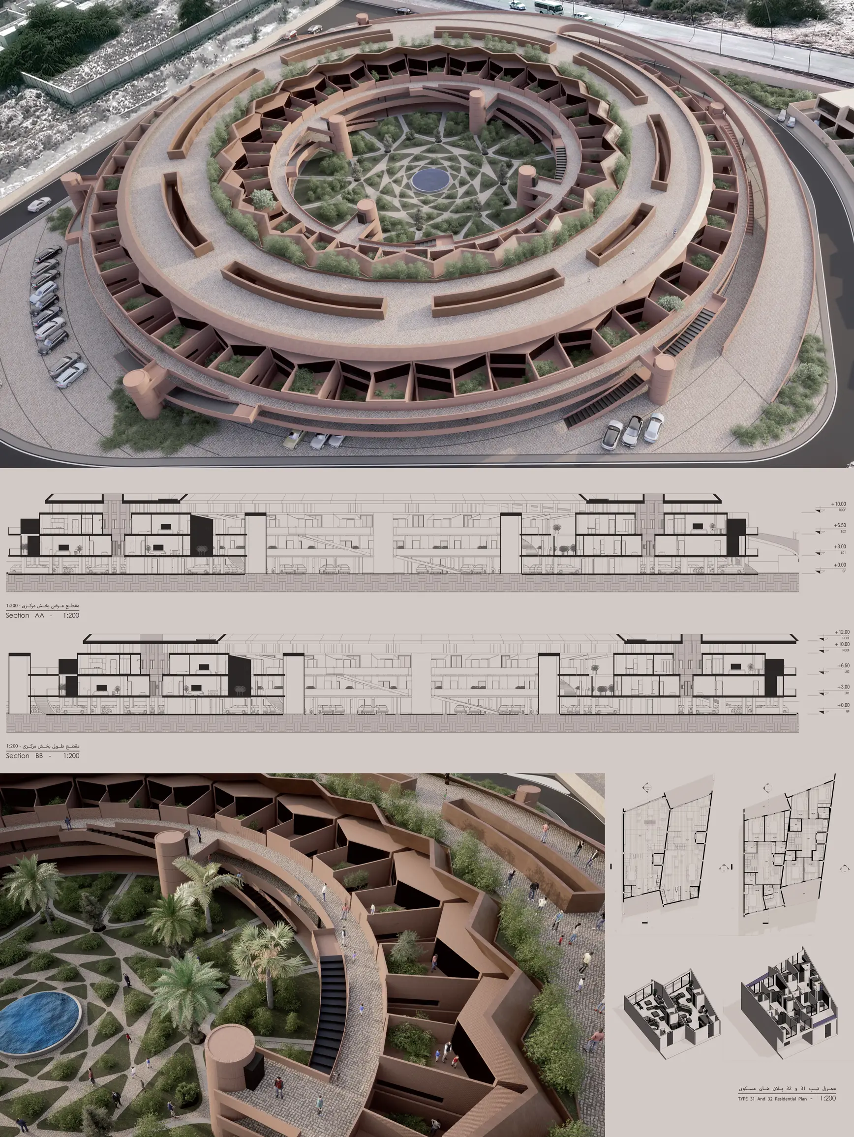 یک آیکون در مقیاس جزیره در نهایت، هدف ما تنها طراحی یک مجموعه مسکونی نبود، بلکه خواستیم فرمی خلق کنیم که از دید پرنده یا نمای هوایی، مانند یک آیکون معماری در جزیره بدرخشد؛ شکلی دایرهای، منسجم و شاخص که هویت شهرک را از فراز آسمان نیز نمایان سازد.